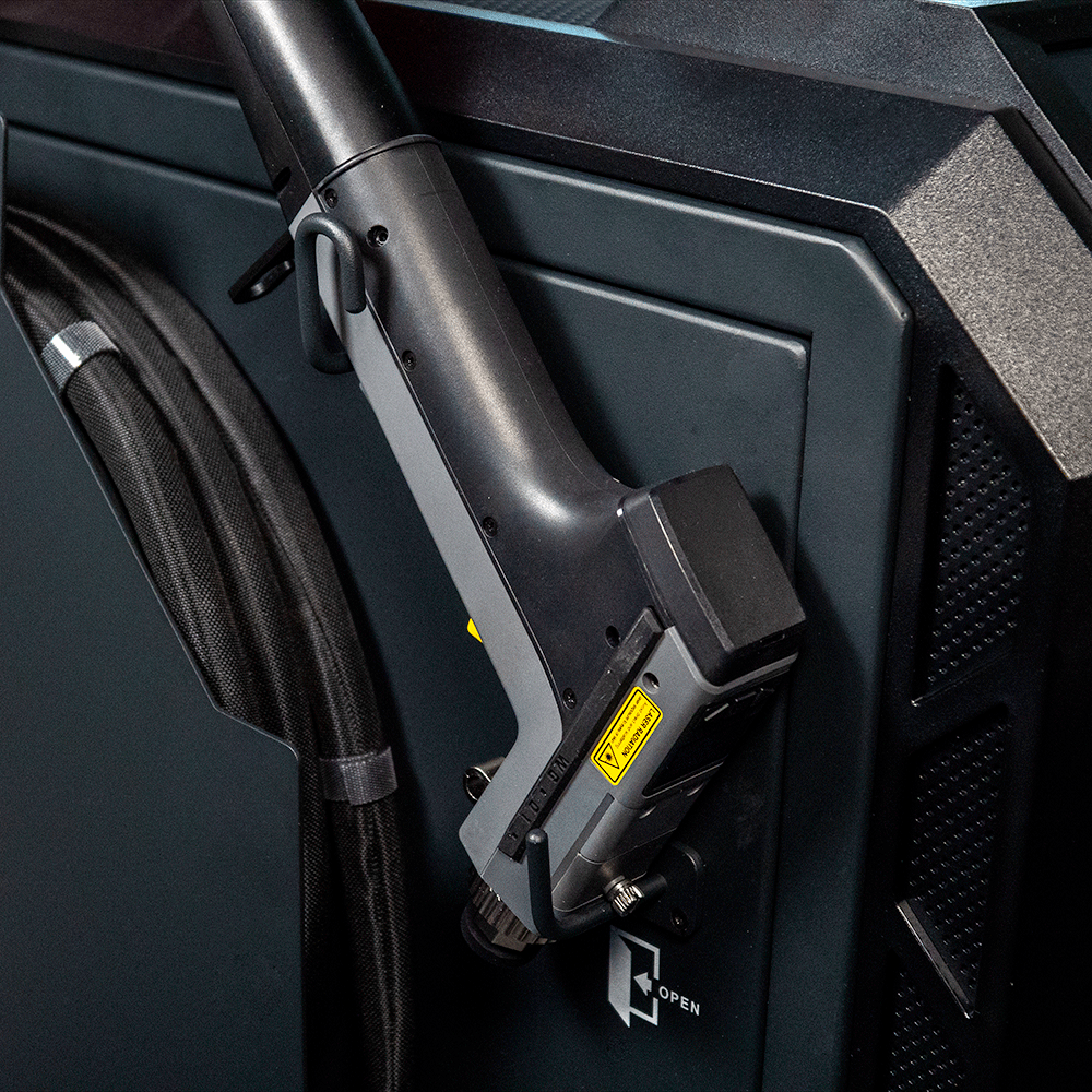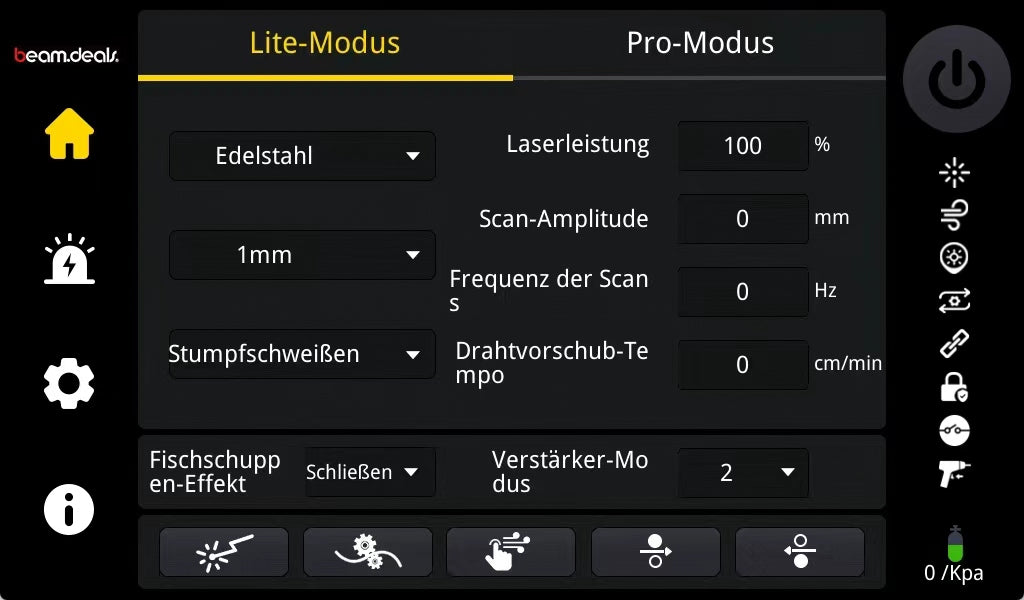 Das Herzstück ist die Handoptik mit Schutzfenster, Gasführung und Scan/Wobble-Funktion. Sie steuert, wie Energie ins Material eingebracht wird: als fokussierter Punkt, als „schwingende“ Linie (Wobble) oder als flächige Führung – je nach Modus und Düsensatz. Parameter wie Laserleistung, Scan-Amplitude und Scan-Frequenz sind direkt einstellbar. :contentReference[oaicite:5]{index=5}
